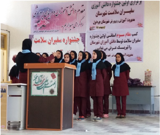 سپس گروه سرود سفیران سلامت برنامه خویش را جرا نمودند ودرپایان به فعالان برنامه سفیران سلامت جوایزی اهدا گردید وبسته های بهداشتی به مناسبت هفته سلامت در بین کلیه دانش آموزان شرکت کننده توزیع گردید.